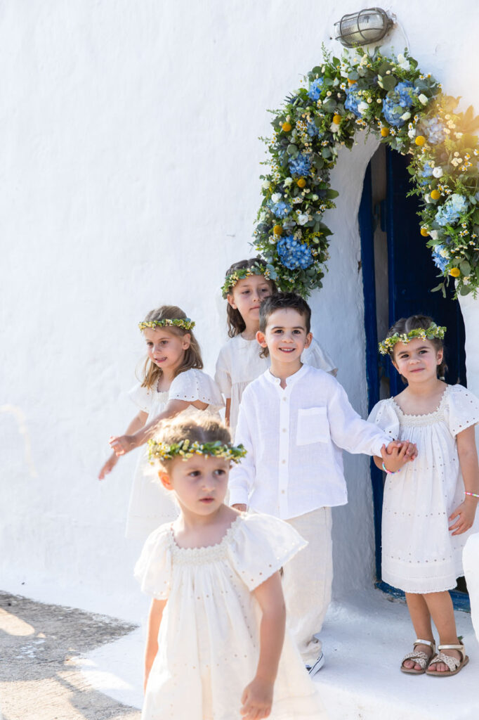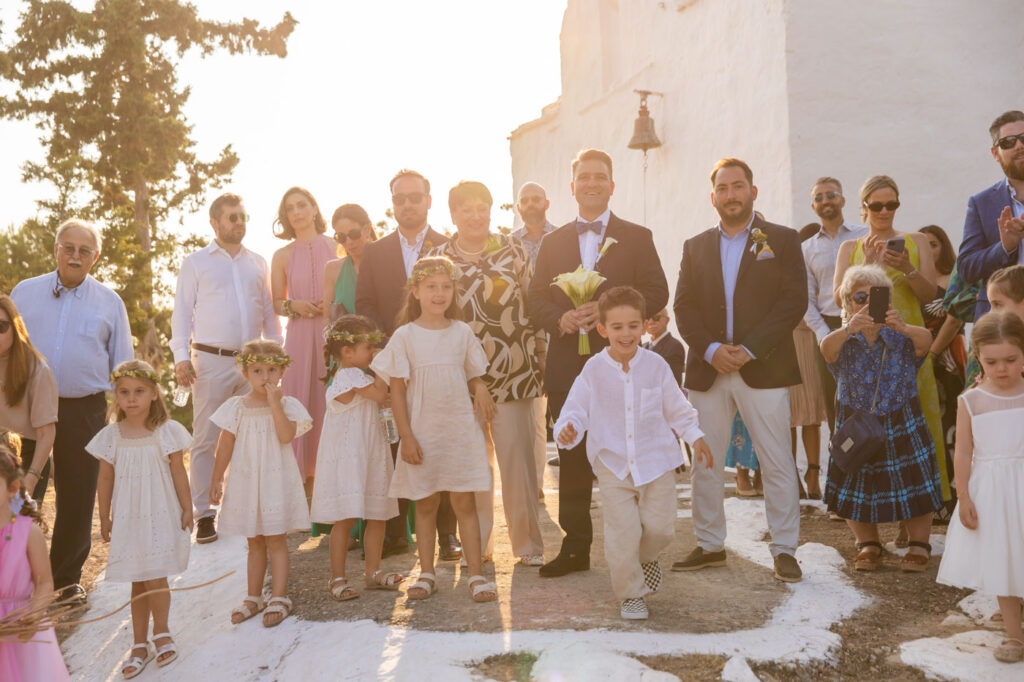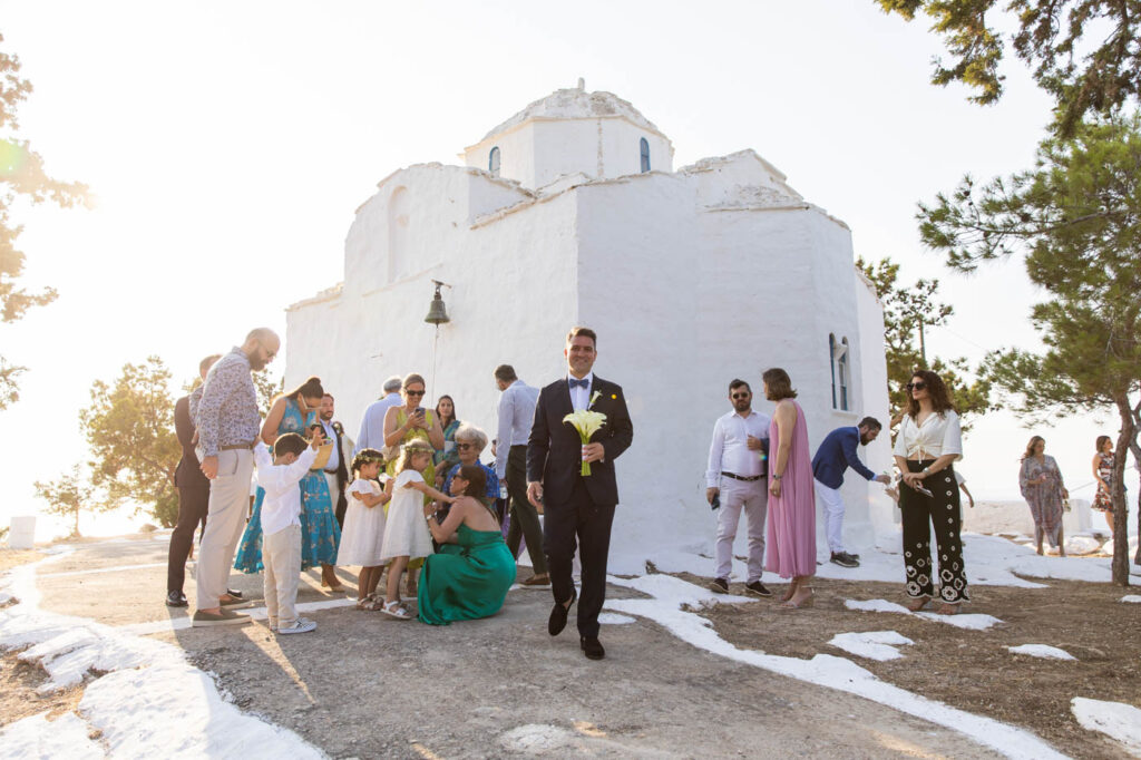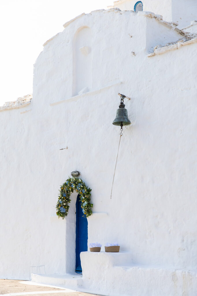 On the charming island of Aegina, The ceremony took place at a small, picturesque white-and-blue chapel—Agios Nikolaos—perched just above the sea. Its simplicity matched the couple’s vision perfectly. The whitewashed walls reflected the afternoon light, while the vivid blue dome echoed the endless sky and Aegean waters beyond. There was something deeply poetic about this setting: a timeless Greek symbol, standing quiet and still, as Myrtw and Thanasis exchanged their vows. No excess, no spectacle—just a sacred space, filled with sunlight, sea breeze, and the soft murmur of heartfelt promises. It felt less like a venue and more like a guardian of memories.