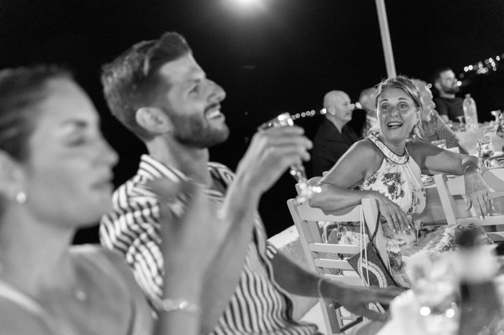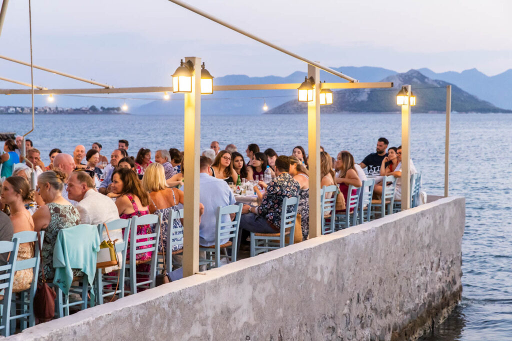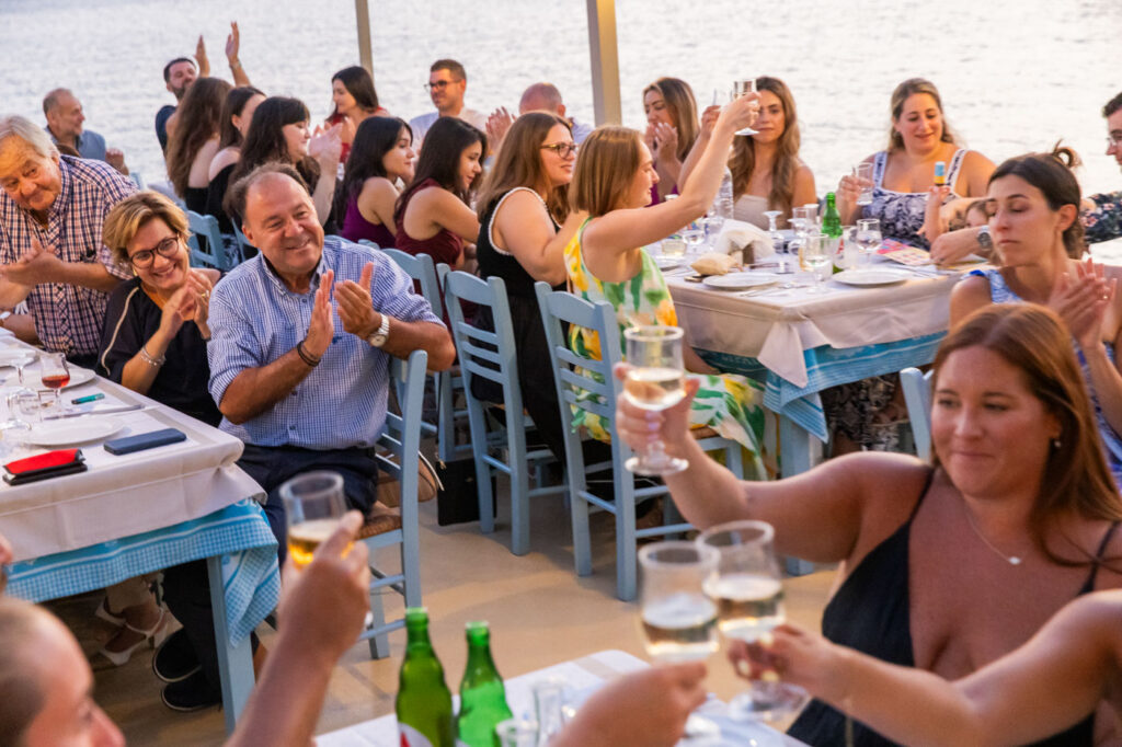 Set against the soft sunset over the Saronic Gulf, the taverna’s terrace buzzed with guests, many of whom had flown in from the USA, joined by Alexander’s family, rooted in the soul of Aegina. This Greek island always provides a beautiful canvas, but this night brought something more—an authentic expression of love, culture, and community.